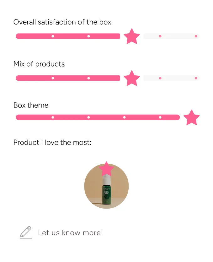 We always want to improve your boxes 💖 That's why you can rate your box and individual products in the app, share your opinion and give feedback.
